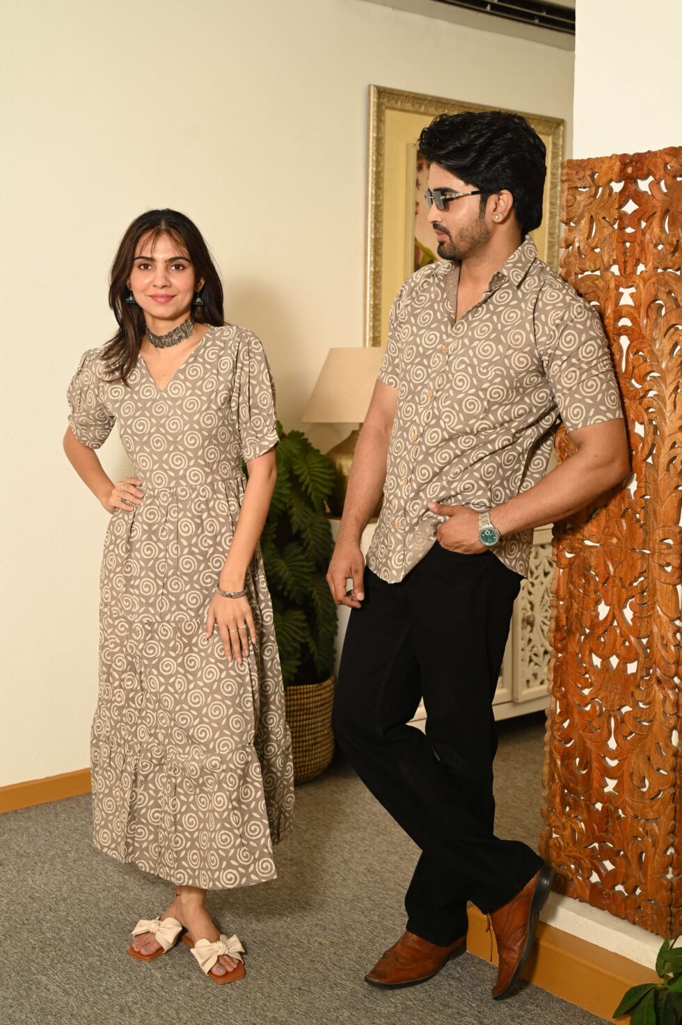 Couple Matching Beige Cotton Anarkali Midi Dress and Shirt Set ? Swirl Block Print